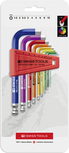 The PB 212.H-10 RB CN - a set of 9 color coded Key L-wrenches in a practical plastic holder, ideal for hexagon socket screws. These L-wrenches are designed for hexagon socket screws, offering precise chamfered edges for easy insertion. Crafted from a special alloy based on spring steel, they provide exceptional elasticity and high-grade hardening for superior performance. Each wrench is laser-marked with a unique serial number and backed by a lifetime guarantee, ensuring reliability and durability for all your tasks.