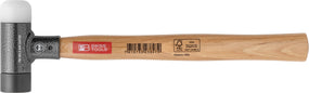 The PB 300 Dead-blow mallet with a plastic head is designed for straightening workpieces on machine tables and delivering dead-blow blows during assembly work. Its inserts are made of tough, wear-resistant plastic, ensuring an exceptionally long service life. The FSC® certified hickory wood handle is non-slip, robust, and durable, securely fastened in the tube with a special wedge and heavy dowel pin, but easily replaceable. The hammer head includes weights for recoil damping, providing firm and accurate blows without recoil.
