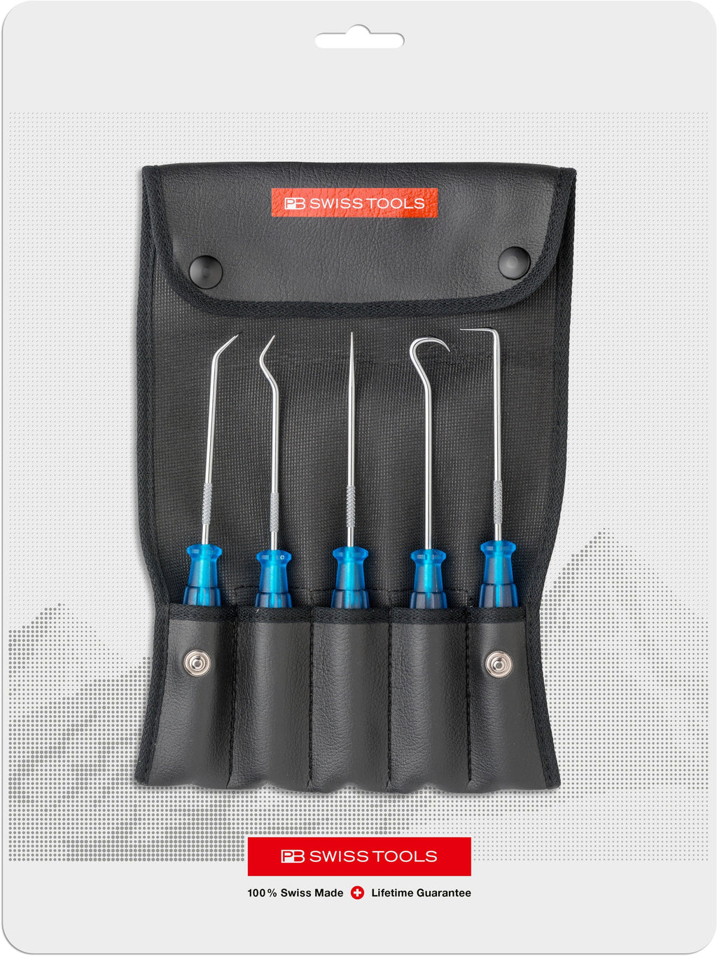 The PB 7685.Set CN PickTool set includes 5 pieces with a multicraft handle for installing and removing seals, O-rings in engines, transmissions, brakes, and air-conditioning units. With 5 different tip designs, universal use for various sealing elements is ensured. Each tip is precisely machined for exceptional durability. The knurled area before the handle provides a secure grip, even in wet or oily environments, while our Multicraft handle ensures a firm grip, even with oily hands. Crafted from a special alloy based on spring steel, these tools offer exceptional elasticity and high-grade hardening for reliable performance. Each tool is laser-marked with a unique serial number, backed by a lifetime guarantee.