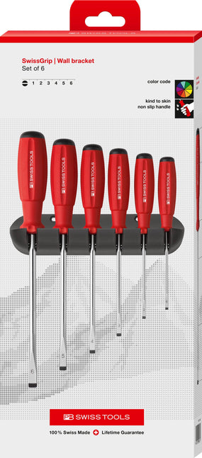 The PB 8240.CBB SwissGrip Screwdriver Set comes with a wall mount and is designed for slotted screws. It features a parallel tip for optimum force transmission and no cam-out. The convex handle with a soft surface provides a pleasant grip and high torque transmission. The screwdrivers are color-coded for quick identification. Crafted from high-quality materials, they are resistant to solvents, oils, acids, and salts. The special alloy based on spring steel ensures exceptional elasticity and high-grade hardening, delivering top-notch performance. Each screwdriver is laser-marked with a unique serial number and comes with a lifetime guarantee, ensuring reliability and durability for all your tasks.
